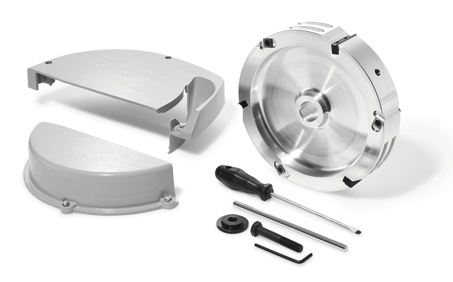 Hobelkopf Ø 250 x 500 mm, 1 x HM-Vorschneider 14 x 14 x 2,0 mm, 1 x HM-Wendemesser 50 x 12 x 1,5 mm, Schutzhaube (fest), Schutzhaube (beweglich), Spannleisten, Stift Werkzeugwechsel, Schraubendreher 7 x 125 mm, Innensechskantschlüssel, im Karton