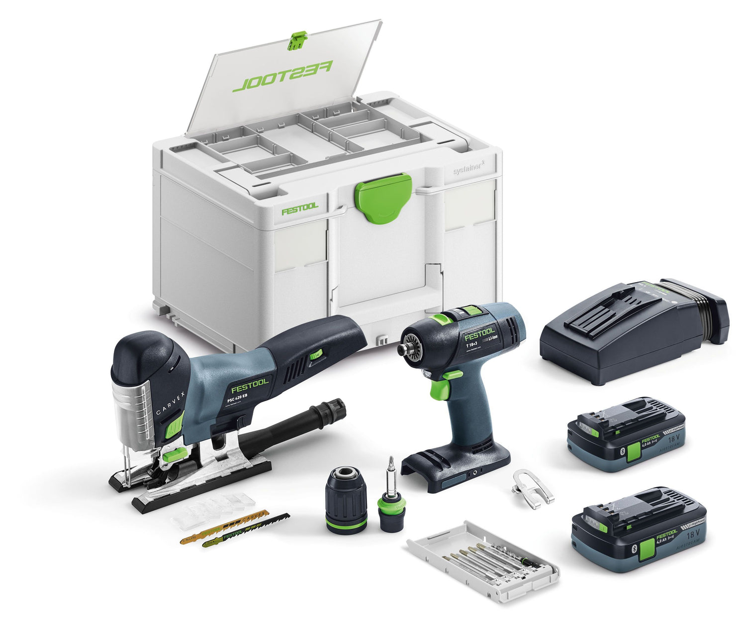 Akku-Bohrschrauber T 18+3, Pendelstichsäge PSC 420 EB, 2 x Akkupack BP 18 Li 4,0 HPC-ASI, Schnellladegerät TCL 6, Werkzeugfutter WH-CE CENTROTEC, CENTROTEC Magnet-Bithalter BH 60 CE-Imp, FastFix Schnellspannbohrfutter 13 mm KC 13-1/2-K-FFP, Stichsägeblatt-Set: 1x WOOD FINE CUT S 75/2,5 und 1x WOOD UNIVERSAL S 75/4 FSG, Splitterschutz, Bitkassette BKS SYS3 D5 PZ TX 100 CE, Gürtelclip, Systainer SYS3 DF M 237